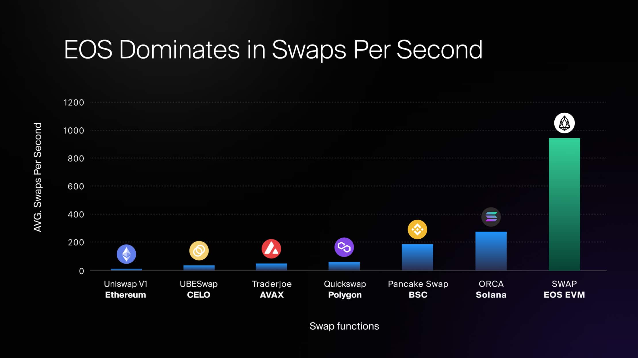 Swaps are complex actions for an EVM to take as they combine multiple smaller transactions. EOS EVM outperforms competitors in this area.