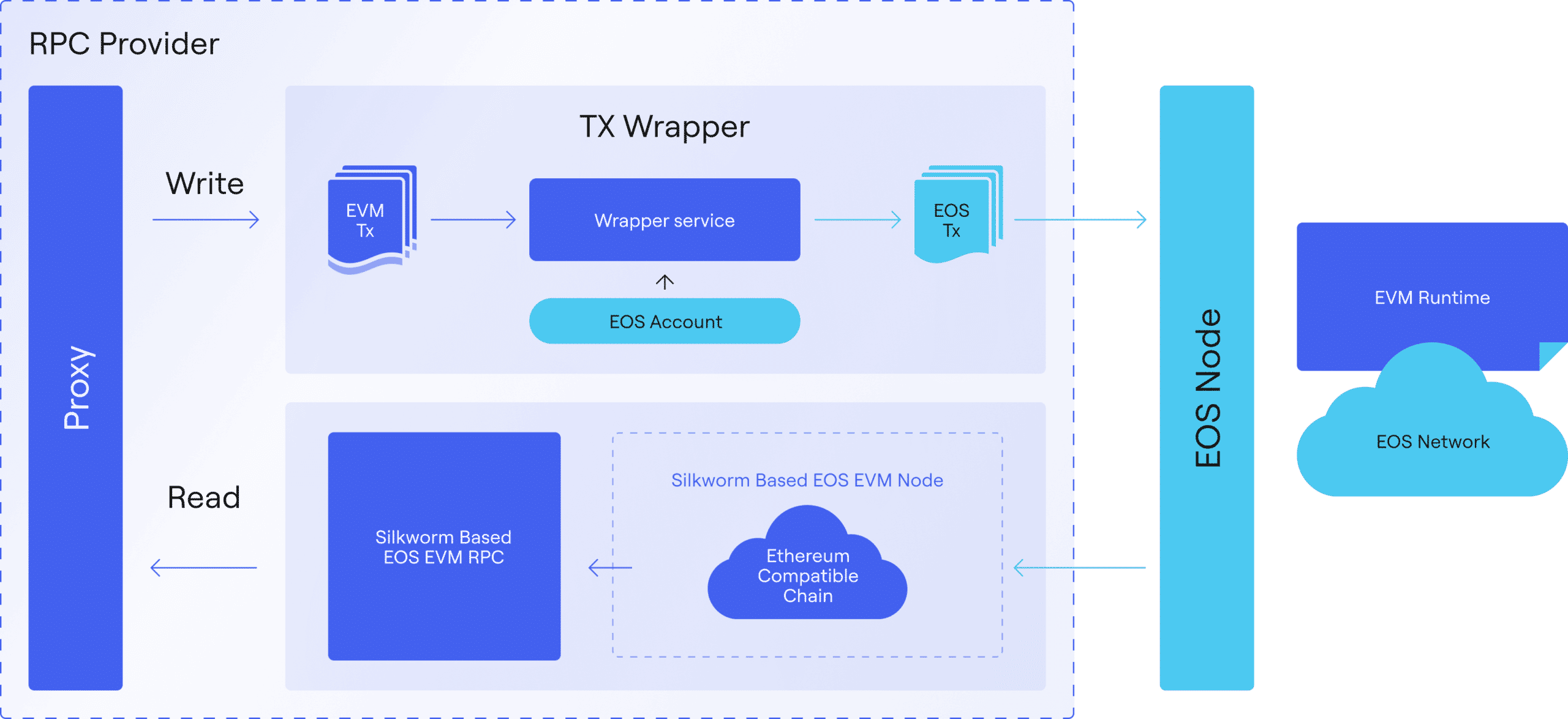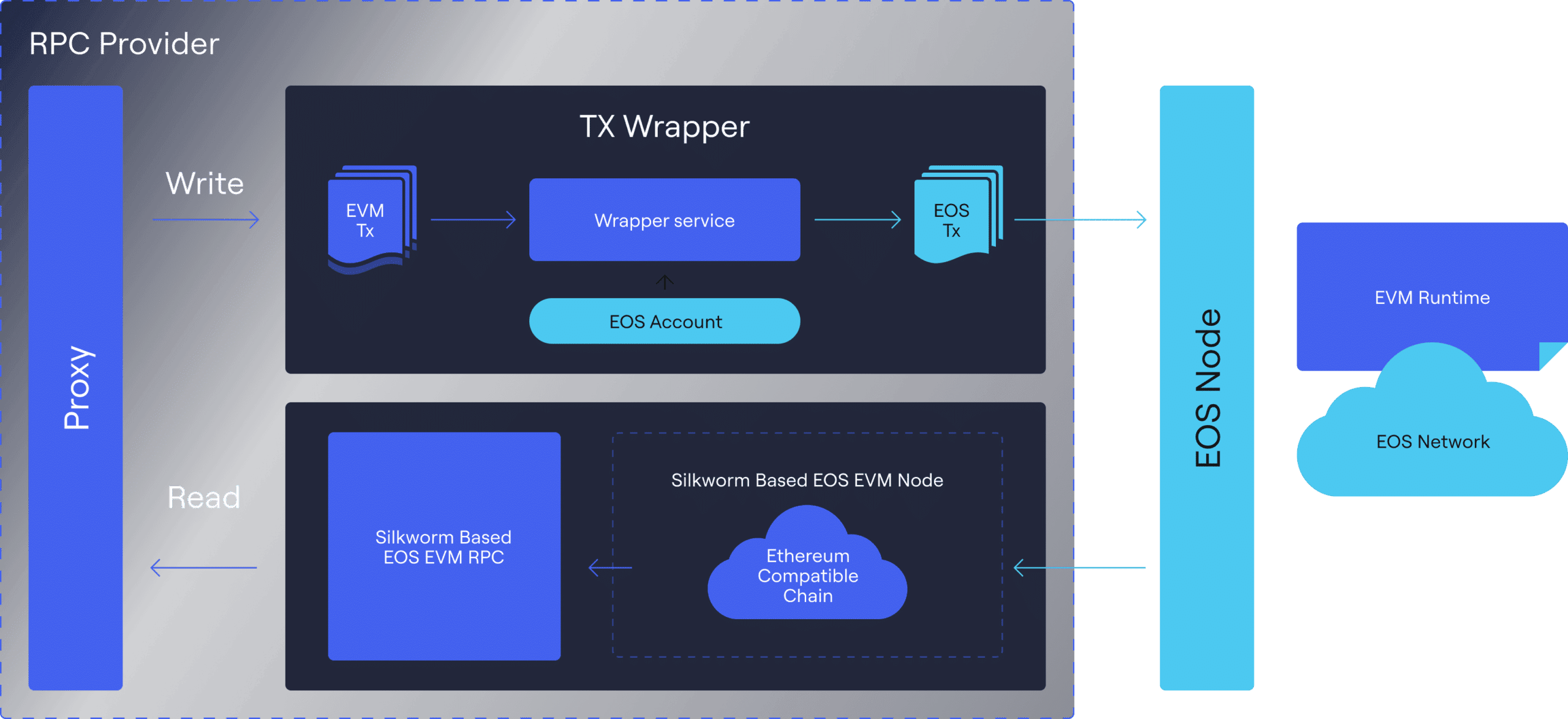 At its core, EOS EVM is an emulation of Ethereum’s EVM, launched on top of the EOS Native architecture. The infographic below provides a high level look at all the moving parts. Check out the Architecture Deep Dive for more information.