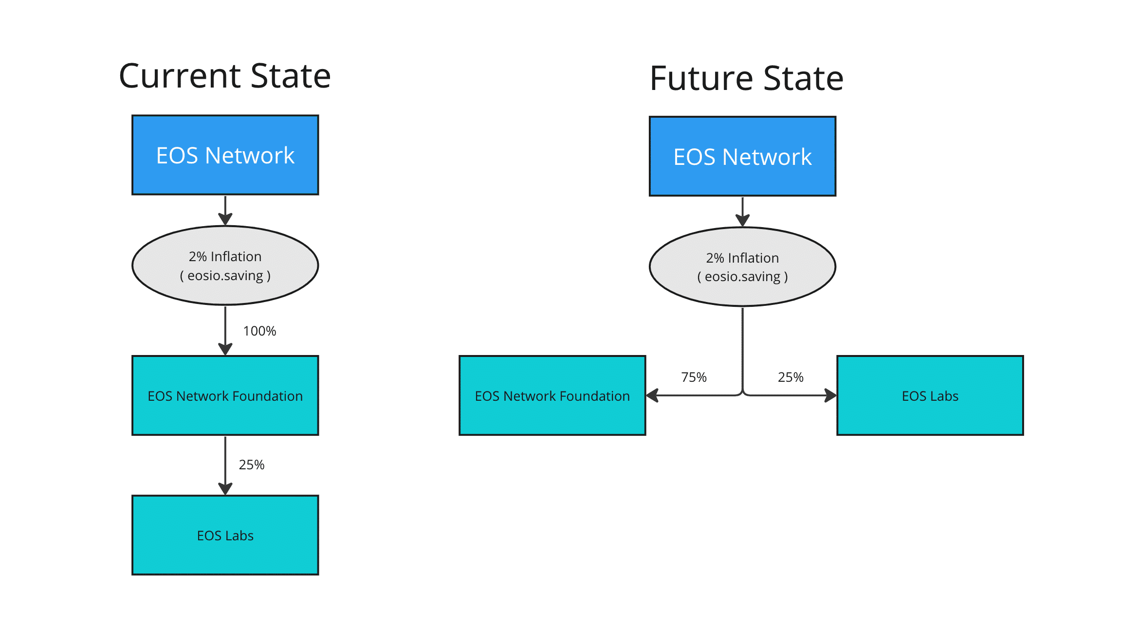 Historically, the groundwork for EOS Labs’ proposed financial autonomy traces back to February 7th, 2023. On this date, EOS Network BPs ratified an MSIG proposed by EOS Asia, leading to the addition of a significant new smart contract to the eosio.saving account. Originally, the default parameter is set to channel all funding into the eosio.grants account, overseen by the EOS Network Foundation, but the addition of this new contract provides a mechanism for funds to be systematically directed towards various other accounts. This change has enabled the possibility for multiple entities to receive continuous funding directly from EOS Network inflation, which currently stands at 2% overall.