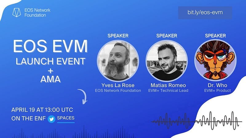 4월 19일 22:00(한국시간)에 EOS EVM 출시 이벤트 + AMA에 참여하시기 바랍니다!