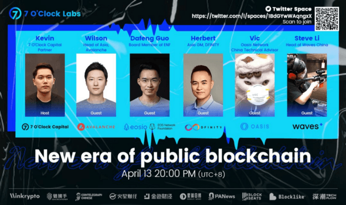 4월 13일, 7 O’clock Labs는 EOS, Avalanche, Dfinity, Oasis 및 Waves를 포함한 5개의 유명 퍼블릭 블록체인의 대표자들을 초청하여 토론을 진행했습니다. EOS 네트워크 재단의 이사회 멤버인 Dafeng Guo는 230명 이상의 사용자를 유치한 해당 이벤트에 초대되었습니다.