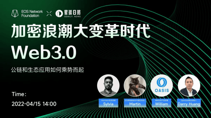 4월 15일, 중국 EOS 네트워크 재단 대표 Martin은 Web3 등의 주제에 대한 심층 토론을 위해 Odaily Planet Daily 온라인 AMA 이벤트에 초대되었습니다. 이 이벤트는 500명 이상의 유저들이 참여했으며 Q&A 세션에서는 많은 사용자가 EOS의 향후 발전과 EOS EVM의 트랜드에 관심을 보였습니다.