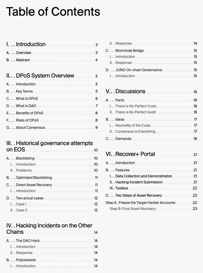 We published the Recover+ Blue Paper to foster the next era of DeFi on EOS with ever more security, safety, and reliability. The Recover+ Blue Paper examines how to build an asset recovery framework for hacking incidents around the DPoS governance system of EOS, which can be reflected in the product logic and functionality of the Recover+ Portal.