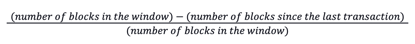 The calculation uses an exponential moving average of an account’s chain utilization, using linear extrapolation when given limited data. It multiplies the currently accumulated average by (number of blocks in the window – number of blocks since the last update) / (number of blocks in the window).