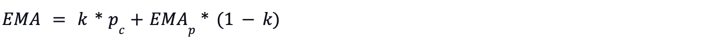 EMAp= Previous period’s EMA, with the first period’s EMA = the SMA of the time window.
