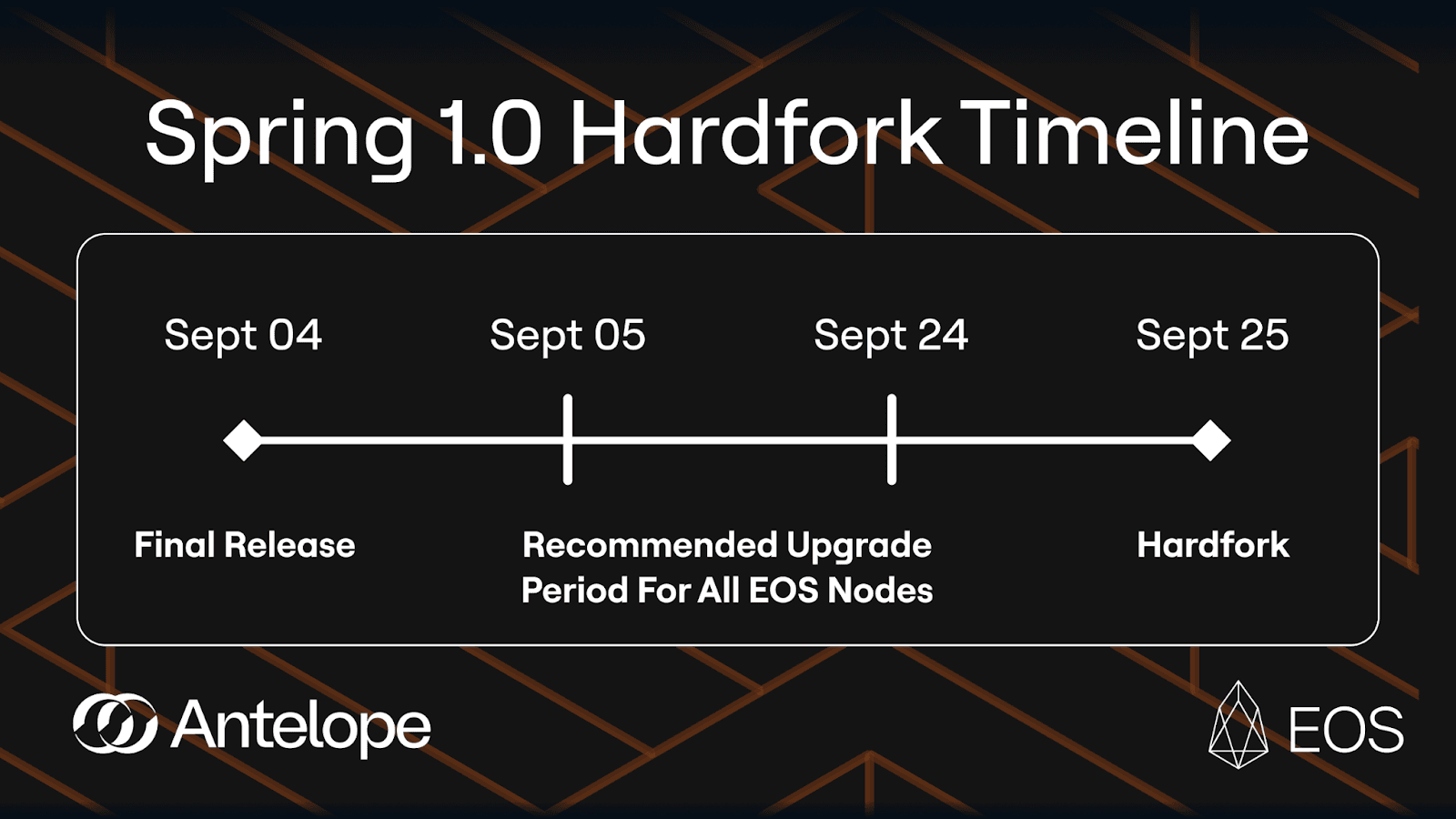 We encourage all block producers and node operators to stay informed by joining the dedicated EOS Upgrade Support and Antelope Node Operators Round Table Telegram groups. Additionally, the EOS Network Foundation hosts weekly Spring 1.0 upgrade Zoom calls every Wednesday at 9a EDT / 1p UTC to discuss planning and coordination for the hard fork.