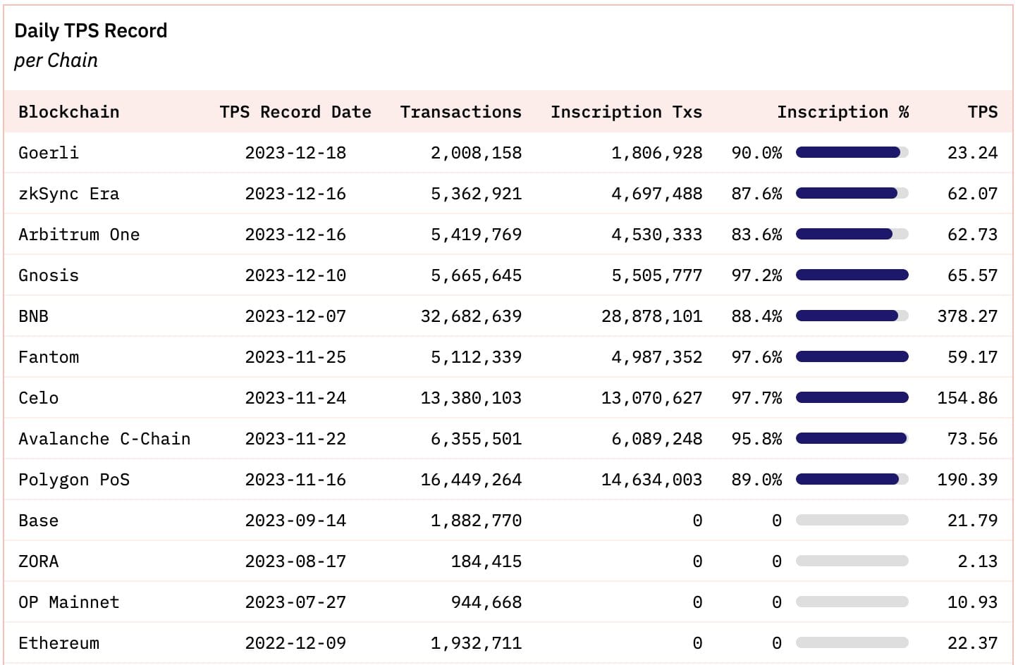 无论您是否认为铭文对于区块链开发人员来说是一种创新,有一点是肯定的。 与铭文事件相关的交易量的增加,对业界许多 EVM 的实时压力测试做了出色的工作。 铸币成本降低,意味着更多人有动力大量参与。 这种活动的增加导致交易费用增加、网络拥塞,甚至业界一些最受欢迎的 EVM 出现网络停机。