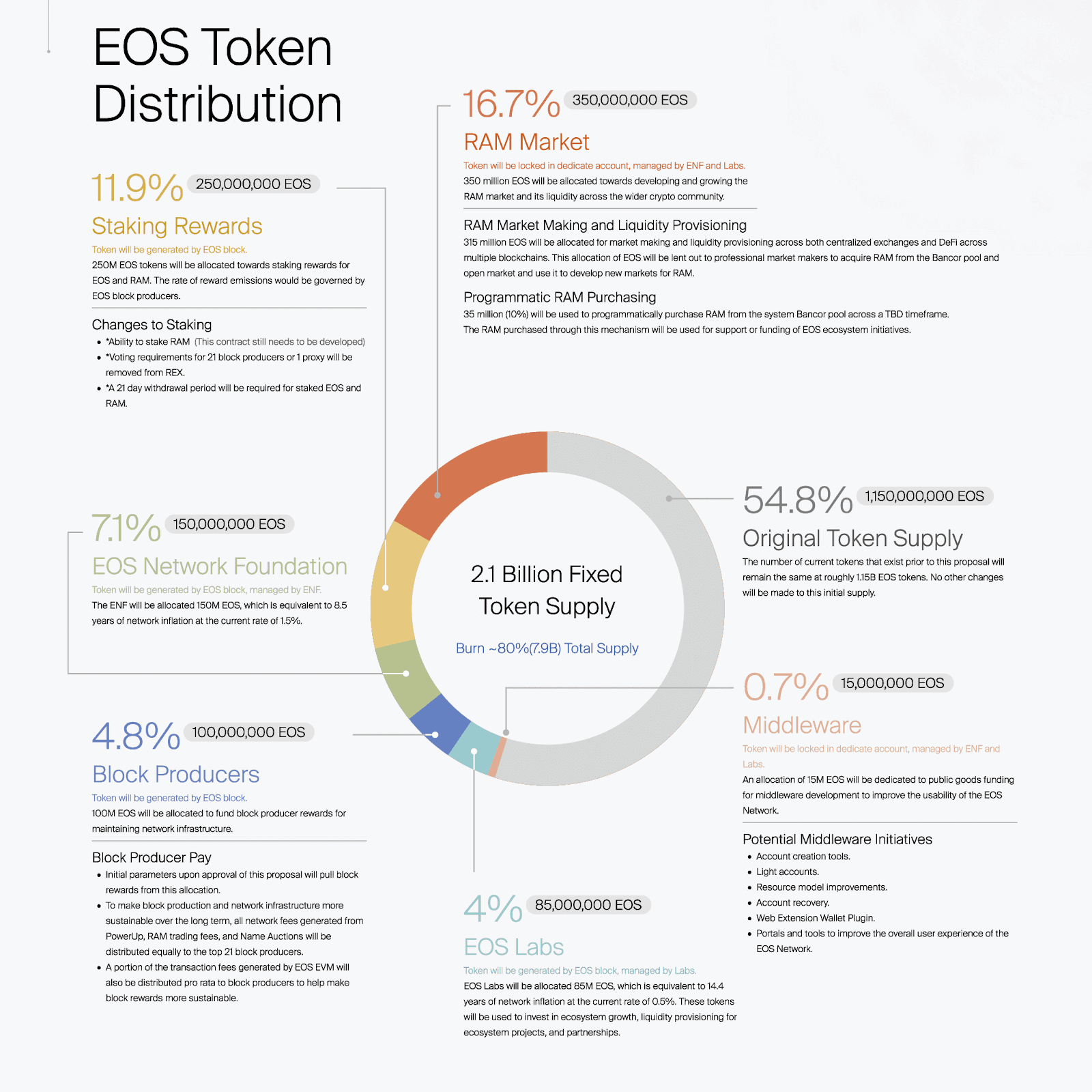 总共 3.5 亿个 EOS 代币将被分配用于增强和发展 RAM 市场,这对于 EOS 生态系统的运营效率和可扩展性至关重要。 这笔巨额分配由 EOS 网络基金会(ENF)和实验室管理,并得到区块生产者的批准,确保资金得到战略性和透明的使用。