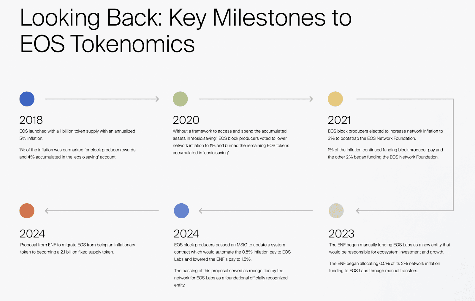 - 与比特币叙事一致:21 亿枚代币的选择是战略性选择,与比特币 2100 万枚的上限平行,增强了 EOS 的吸引力和稳定性。