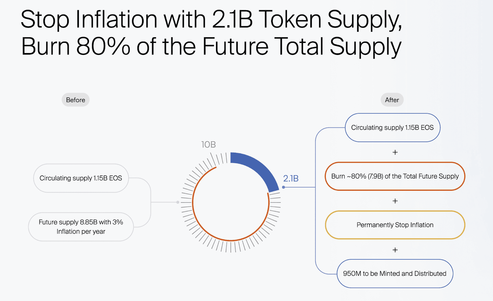 Yves 提议将未来代币供应大幅减少约 80%,从而对 EOS 代币供应进行了重大转变。 新提案旨在将 EOS 代币供应量限制在 21 亿个代币,从通货膨胀型代币供应过渡到固定代币供应量。 这一变化使 EOS 与比特币等成功的加密货币模型保持一致,众所周知,比特币的固定供应上限为 2100 万个代币。